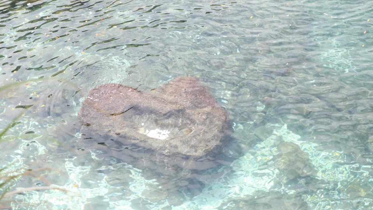 海の中の、このハートの岩の中に先程の白い石を投げるようです。